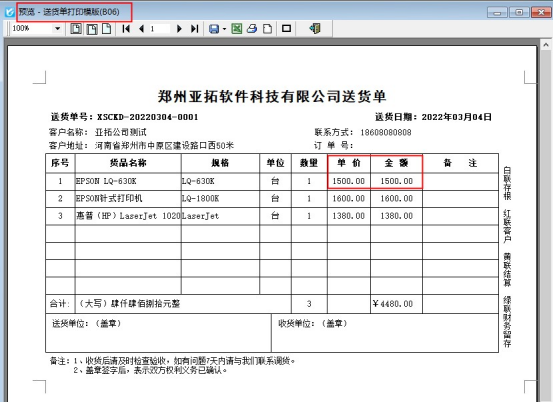 新增一個(gè)送貨單,保存單據(jù)后預(yù)覽默認(rèn)模板顯示單價(jià)和金額,如下圖所示: