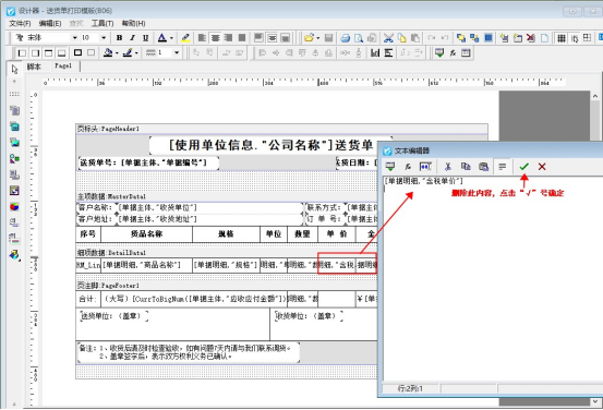 在送貨單開(kāi)單界面,點(diǎn)擊打印按鈕下的“打印格式設(shè)計(jì)”,選擇此模板,點(diǎn)擊“設(shè)計(jì)格式”進(jìn)入模板設(shè)計(jì)器界面。在模板設(shè)計(jì)器中,把單價(jià)和金額對(duì)應(yīng)的明細(xì)數(shù)據(jù)項(xiàng)文本框雙擊打開(kāi),把里面調(diào)用的數(shù)據(jù)項(xiàng)刪除,然后保存模板,如下圖所示: