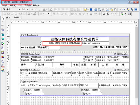 一、默認(rèn)模板,公司地址調(diào)用系統(tǒng)參數(shù)使用單位信息中的內(nèi)容,模板設(shè)計界面(開單界面打印下選擇打印格式設(shè)計,設(shè)計格式可查看)如下圖: