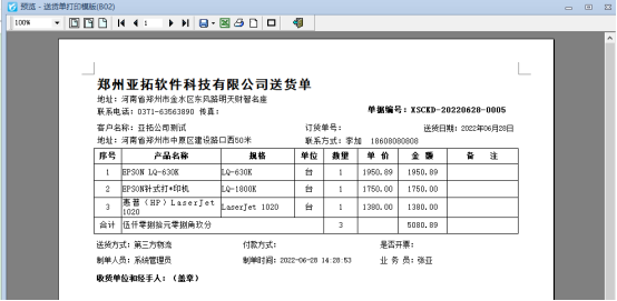 功能導航窗點擊“業務處理”—》“新開送貨單”,新增并保存一張送貨單單據,工具欄“打印”下點擊“打印格式設計”,在打印格式設計界面選擇模板點擊“設計格式”進入打印模板設計器界面,示例模板:送貨單打印模版(B02),如下圖所示: