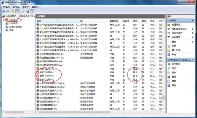打開“控制面板”→“系統(tǒng)和安全”→“Windows防火墻”→“高級設(shè)置”→“入站規(guī)則”,把被阻止的應(yīng)用服務(wù)程序刪除掉,然后重新添加端口到防火墻即可。