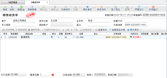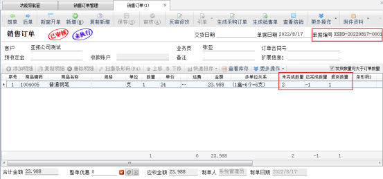 銷售退貨單引單訂單審核完成后,進入銷售訂單管理界面,打開引單過的銷售訂單,可以看到訂單的完成數量以及退貨數量已更新。