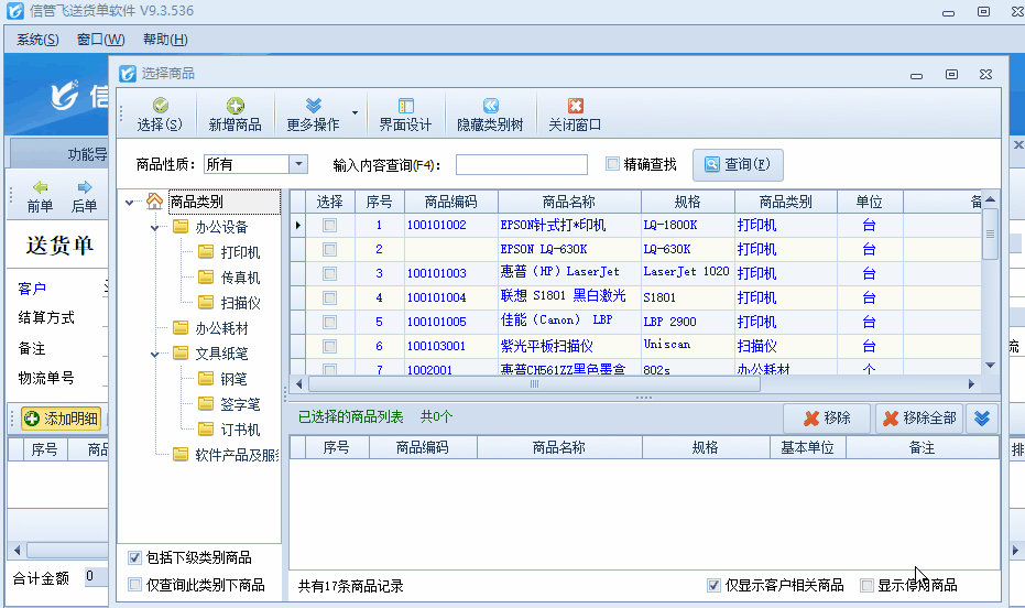 信管飛送貨單軟件開送貨單前可提前添加好商品信息到基礎資料中,新開送貨單選擇客戶后,選擇“添加明細”可彈出選擇商品界面,可選擇添加好的商品信息,有用戶反映在選擇商品界面,查詢窗口輸入商品簡寫不自動過濾,需要點擊下查詢才會進行檢索,如下圖所示: