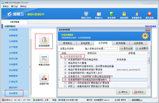 在功能導(dǎo)航窗點(diǎn)擊“系統(tǒng)管理”—》“系統(tǒng)參數(shù)設(shè)置”—》“業(yè)務(wù)參數(shù)”,然后在業(yè)務(wù)單據(jù)明細(xì)參數(shù)中啟用“在單據(jù)明細(xì)中添加商品后自動增加新行”參數(shù),如下圖所示: