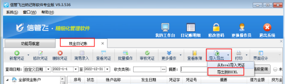 本文以“出納現(xiàn)金日記賬”為例進行示范導入操作,導入需要特定模板,可以在現(xiàn)金日記賬界面導出Excel文件作為模板,然后打開Excel文件整理之前的日記賬憑證,如何導出憑證Excel模板如下圖所示: