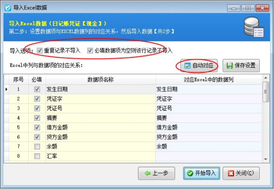 如果有多個資金賬戶,需要按資金賬戶進行導入,選擇資金賬戶后選擇Excel文件,下一步進行數(shù)據(jù)項對應,可以點擊“自動對應”按鈕,可自動對應Excel表頭內(nèi)容和軟件中數(shù)據(jù)項,對應完成點擊“開始導入”,導入完成有導入結(jié)果。如下圖所示: