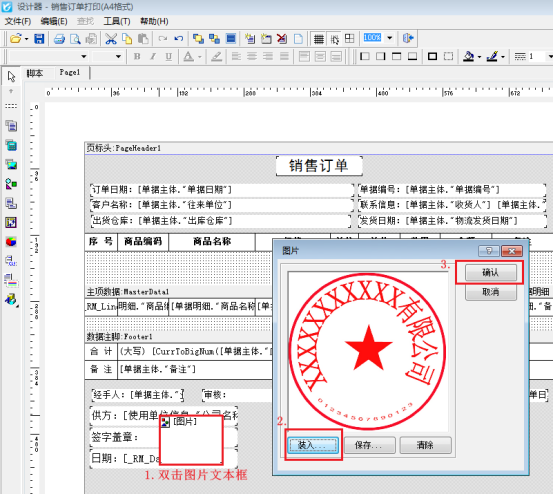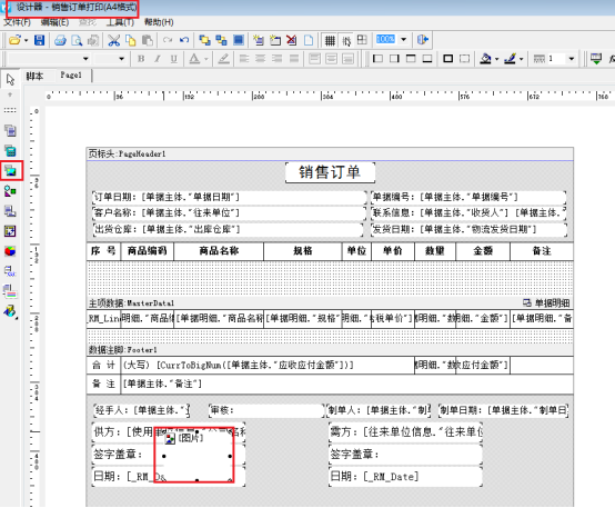 導航欄選擇“業務處理”—》“新開訂單”—》打印—》打印格式設計—》設計格式,進入打印模板的設計器界面,點擊左側工具欄的“插入圖片”把圖片放在設計器界面的蓋章位置中,如下圖所示: