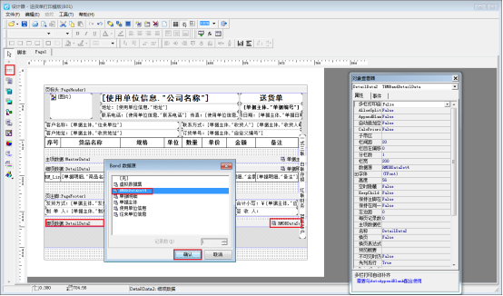 之后返回到銷(xiāo)售出庫(kù)單界面,點(diǎn)擊“打印”—》“打印格式設(shè)計(jì)”—》“設(shè)計(jì)格式”,點(diǎn)擊左側(cè)工具欄“插入邊條”,插入細(xì)項(xiàng)數(shù)據(jù)欄,雙擊細(xì)項(xiàng)數(shù)據(jù)處,選擇“RMDBDateSet4”數(shù)據(jù)源,之后點(diǎn)擊確定,如下圖所示: