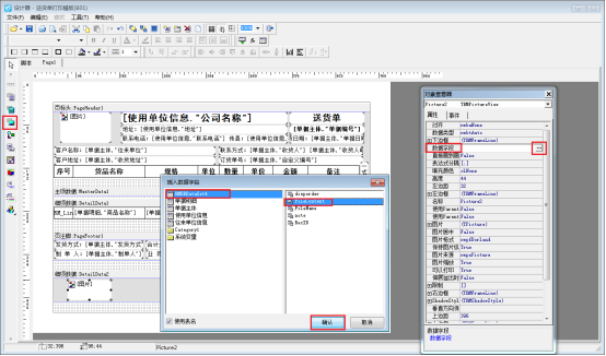 再次點(diǎn)擊左側(cè)工具欄“插入圖片”,把圖片放在剛添加的數(shù)據(jù)欄內(nèi),選中圖片數(shù)據(jù)項(xiàng),鼠標(biāo)右鍵勾選顯示屬性,數(shù)據(jù)字段處選擇“RMDBDateSet4”“FileContent”,之后點(diǎn)擊確認(rèn),如圖所示: