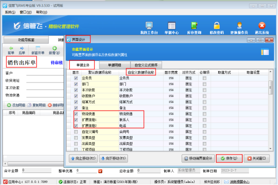 參數(shù)設(shè)置完成,“銷售管理”中打開銷售出庫單界面。點(diǎn)擊“界面設(shè)計(jì)”,單據(jù)主體中勾選“物流快遞、擴(kuò)展信息1和擴(kuò)展信息2”并上移至備注下邊,擴(kuò)展信息1和擴(kuò)展信息2修改自定義數(shù)據(jù)項(xiàng)名稱為“聯(lián)系人”和“電話”,如下圖所示: