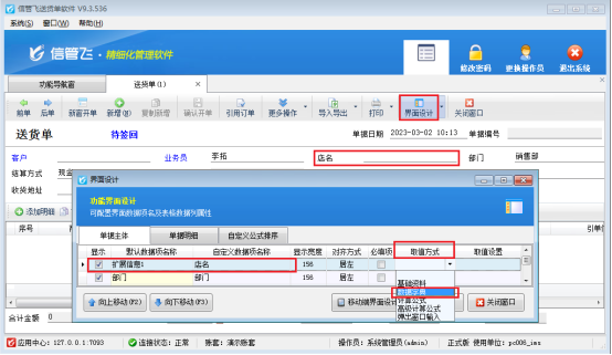 有用戶存在多家門店的情況,需要按照每家門店進行明細匯總統計。以“送貨明細對賬單”為例,示范下如何在界面設計中配置。首先在功能導航窗選擇“業務處理”進入新開送貨單界面,點擊“界面設計”按鈕,在打開的界面設計窗口中找到“擴展信息1”數據項,可自定義列名為店名,擴展信息1(店名)可以使用數據字典維護,開單方便直接選擇,如下圖所示: