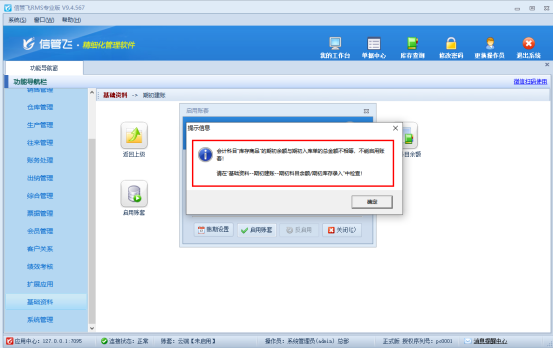 信管飛RMS專業(yè)版支持財(cái)務(wù)處理模塊,存在會(huì)計(jì)科目。新用戶使用軟件時(shí),在賬套啟用前錄入了期初入庫單,錄入庫存數(shù)量和成本,保存后在賬套啟用界面點(diǎn)擊啟用賬套,會(huì)提示如圖以下消息,啟用不了賬套。