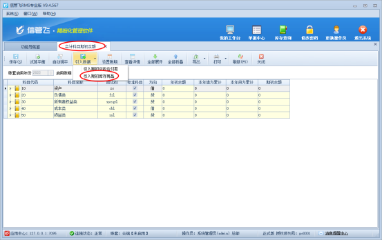 按提示在基礎(chǔ)資料—期初建賬中打開期初科目余額界面,在工具欄點(diǎn)擊“引入數(shù)據(jù)”,選擇“引入期初庫存商品”如下圖所示: