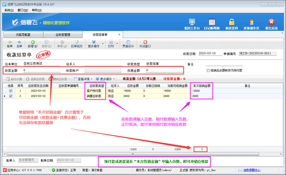 客戶預付款是客戶提前預付給我們的金額,可以用來沖銷銷售產生的應收款,本文以信管飛出納記賬軟件為例演示一下客戶預付款部分沖銷銷售應收款,如何開收款結算單?