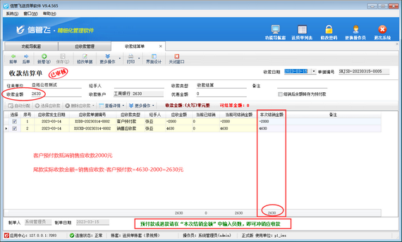 在收款結算單收款金額內錄入2630元,客戶預付款“本次結銷金額”內錄入-2000元,銷售應收款“本次結銷金額”錄入4630元,然后保存收款結算單。
