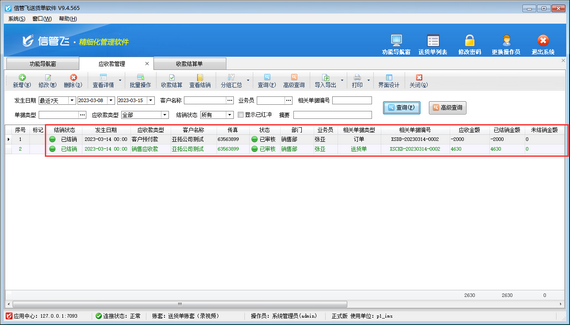 以信管飛送貨單軟件為例,在功能導航窗點擊“業務處理”—》“應收款管理”打開“應收款管理”界面。訂單如有錄入“預付定金”,系統會自動生成了一筆未結銷的“客戶預付款”記錄,客戶預付款應收金額為負數顯示。送貨單確認開單后系統會自動生成了一筆未結銷的“銷售應收款”記錄,如下圖所示。