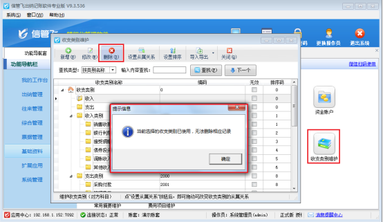 軟件支持日記賬收支類別維護(hù)設(shè)置,當(dāng)刪除收支類別時(shí)提示“當(dāng)前選擇的收支類別已使用,無(wú)法刪除相應(yīng)記錄”,怎么處理?