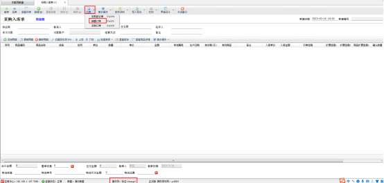 系統管理員登錄,可以看到開采購入庫單界面可以正常引用銷售訂單開單,用操作員賬號張亞登錄,采購入庫單則無法引單銷售訂單,如圖所示: