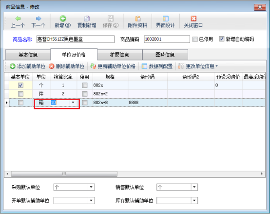 未開單使用過的輔助單位可以在單位及價格界面,單位、換算比率處直接進(jìn)行修改。