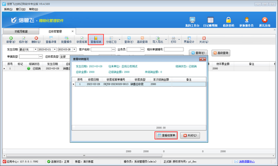 在應(yīng)收款管理界面選擇需要修改的應(yīng)收款記錄,工具欄點擊“查看結(jié)銷”—》“查看結(jié)算單”,打開收款結(jié)算單界面,如下圖所示。