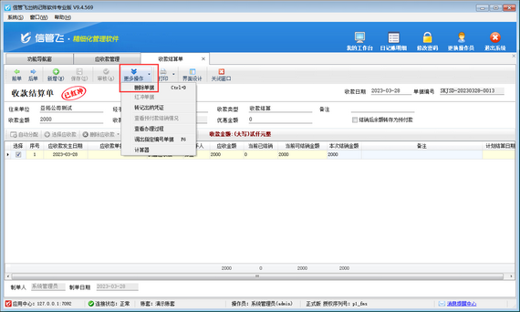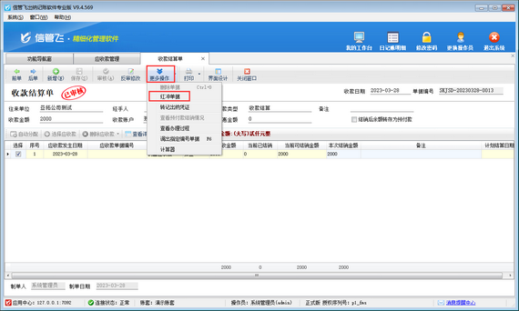 然后在收款結(jié)算單界面點擊“更多操作”—》“紅沖單據(jù)”,如下圖所示,單據(jù)紅沖后,點擊“更多操作”—》“刪除按鈕”,即可刪除收款結(jié)算單。