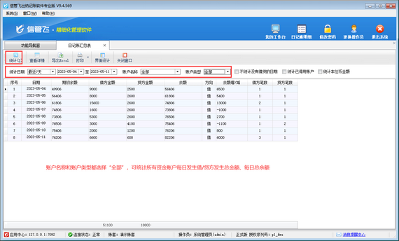 在日記賬匯總表界面,選擇統計日期范圍,賬戶名稱和賬戶類型選擇“全部”,然后點擊“統計”按鈕即可統計查詢日期范圍內每日所有賬戶借/貸方發生總金額、每日余額,如下圖所示。