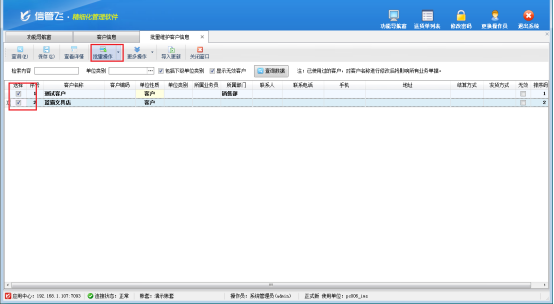 進入批量維護客戶信息界面后,點擊“批量操作”進入批量操作模式,打鉤選擇要批量設置所屬部門的客戶信息。