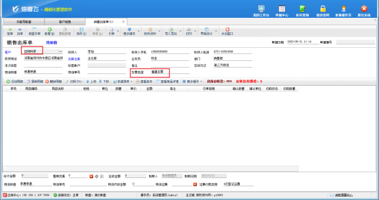 設置完成之后,導航欄點擊“銷售管理”,打開銷售出庫單界面,選擇相關客戶之后,可以看到客戶信息里面設置的默認發票類型已經自動調取出來了,如圖所示: