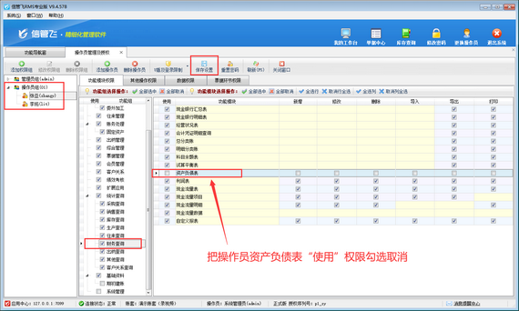 登錄軟件,在功能導(dǎo)航窗點(diǎn)擊“系統(tǒng)管理”—》“操作員及授權(quán)”,進(jìn)入“操作員管理及授權(quán)”界面,選擇操作員“張亞”,在其右側(cè)的功能模塊權(quán)限內(nèi)選擇“財(cái)務(wù)查詢”,將資產(chǎn)負(fù)債表的“使用”權(quán)限勾選取消,然后保存設(shè)置,如下圖所示。