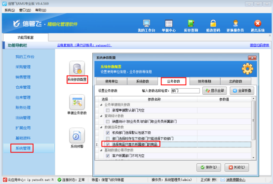 軟件默認不按部門顯示商品,需要按部門顯示需啟用參數配置,功能導航窗點擊“系統管理”—“系統參數配置”,點擊業務參數,勾選參數“選擇商品只顯示所屬部門的商品”并保存配置,如下圖所示: