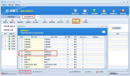 功能導航窗點擊“往來管理”—“收款結算單”進入收款結算單列表界面,工具欄打開“界面設計”,勾選顯示“出納憑證字”“出納憑證號”,并點擊向上移動至合適位置,保存界面設計,如下圖所示: