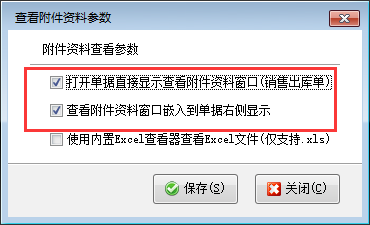 以銷售出庫單為例,在銷售出庫單界面工具欄點擊“附件資料”—》“查看附件資料參數”,可打開“查看附件資料參數”窗口,如下圖所示。