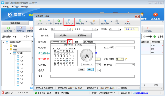 在憑證信息--修改界面,點擊發生日期下拉框,選擇新的發生日期,點擊確定,修改完成后點擊保存,如圖所示: