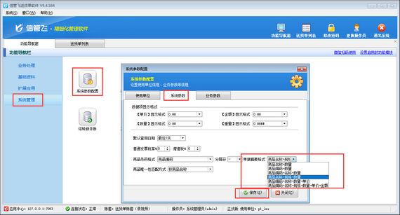在功能導航窗點擊“系統管理”—》“系統參數設置”—》“系統參數”,打開系統參數設置界面,修改單據摘要格式即可,如下圖所示,示例設置單據摘要顯示格式為“商品名稱 +規格+ 數量”。