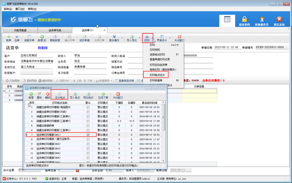 以送貨單軟件為例,打開一個送貨單,在單據(jù)界面工具欄點擊“打印”—》“打印格式設(shè)計”,在打開的打印格式設(shè)計窗口選擇需要調(diào)整的打印格式模板,然后點擊“設(shè)計格式”進入模板設(shè)計器,如下圖所示。