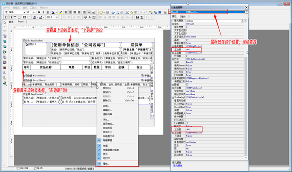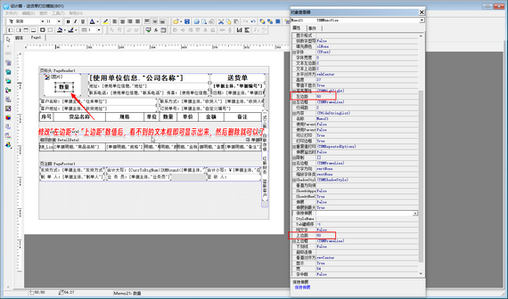 然后修改查找到的文本框“上邊距”及“左邊距”數(shù)值,修改“上邊距”數(shù)值大于最上邊的文本框“上邊距”數(shù)值,修改“左邊距”數(shù)值大于最左邊的文本框“左邊距”數(shù)值,修改完成后,此數(shù)據(jù)項在打印模板設(shè)計器內(nèi)即可顯示出來,然后刪除此文本框就可以,如下圖所示。