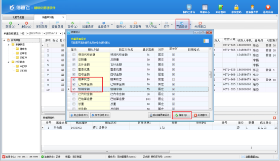參數配置完成后,打開“銷售管理”—》“銷售單列表”界面,界面設計中把數據項“已結算金額、結算余額、結算狀態”勾選顯示,保存界面設計,如下圖所示: