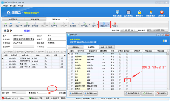 解決方法:在送貨單界面工具欄點擊“界面設(shè)計”,選擇單據(jù)明細(xì),找到“數(shù)量”數(shù)據(jù)項,將數(shù)量“顯示合計”勾選上,然后保存界面設(shè)計,如下圖所示。