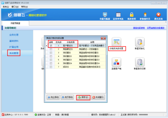 在功能導(dǎo)航窗點擊“系統(tǒng)管理”—“價格優(yōu)先級設(shè)置”,在價格優(yōu)先級設(shè)置中勾選啟用“客戶最近價”并向上移動到第一位,然后保存商品價格優(yōu)先級設(shè)置。如下圖所示: