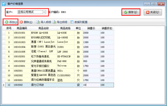 功能導(dǎo)航窗點擊“基礎(chǔ)資料”,打開“客戶價格信息”界面,點擊“新增”按鈕下的“按客戶添加價格信息”,彈出的客戶價格信息界面,先選擇客戶,然后點擊“添加明細(xì)”添加商品信息,輸入銷售價(支持導(dǎo)入操作),輸入完成點擊保存按鈕。如下圖所示: