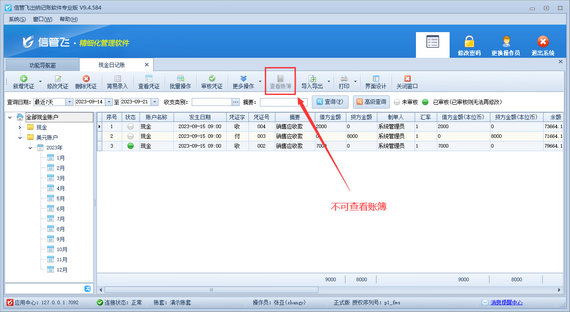 信管飛出納記賬軟件內包含豐富的記賬統計表格,如現金賬簿、銀行賬簿、資金日(月)報表、收支類別匯總表等。有用戶在使用軟件時無法查看出納賬簿,如下圖所示。