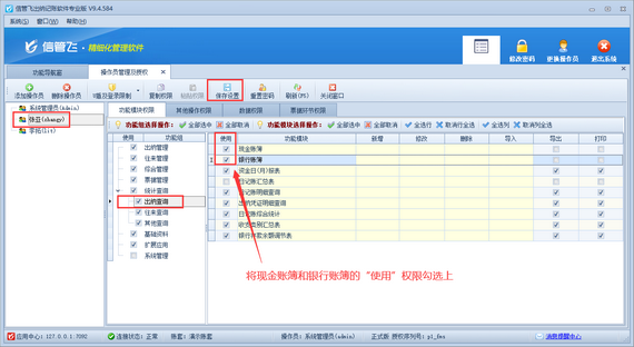 出現此問題的原因是:當前登錄的操作員賬號沒有“現金賬簿”和“銀行賬簿”的查看權限,解決方法如下:使用系統管理員賬號登錄軟件,在功能導航窗點擊“系統管理”—》“操作員及授權”打開操作員管理及授權界面,選擇操作員賬號,在其右側的功能模塊權限內選擇“出納查詢”,將“現金賬簿”和“銀行賬簿”的“使用”權限勾選上,然后保存權限設置,如下圖所示。