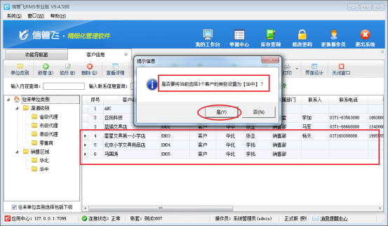 以上圖為例,單位類(lèi)別是“華北”區(qū)域的一共有3條記錄,現(xiàn)在要把這3條記錄的單位類(lèi)別改為“華中”區(qū)域。首先點(diǎn)擊第4行記錄,然后按下Shift鍵不松手時(shí)鼠標(biāo)點(diǎn)擊第6行記錄,這樣就可以同時(shí)快速選中第4行至第6行這3條記錄,選中多條記錄后,再按住鼠標(biāo)左鍵不松手,移動(dòng)到單位類(lèi)別“華中”區(qū)域處,此時(shí)系統(tǒng)會(huì)提示“是否要將當(dāng)前選擇3個(gè)客戶(hù)的類(lèi)別設(shè)置為【華中】?”,點(diǎn)“是”按鈕即可,如圖所示。