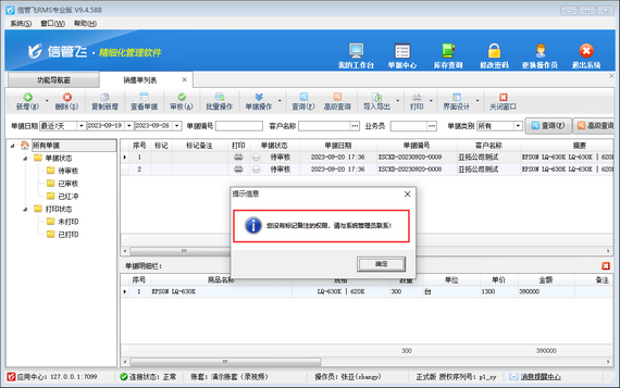 信管飛RMS支持對銷售單列表、采購單列表、銷售訂單列表以及采購訂單列表等標記備注,有用戶在標記單據(jù)備注時無法標記,系統(tǒng)彈出提示信息“您沒有標記備注的權(quán)限,請與系統(tǒng)管理員聯(lián)系!”如下圖所示: