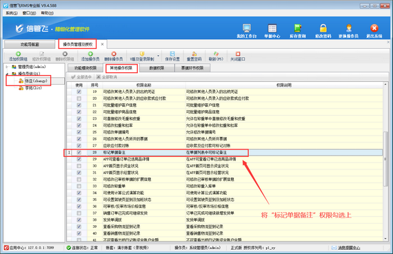 出現(xiàn)此問題的原因是:當前登錄的操作員賬號沒有標記單據(jù)備注權(quán)限,解決方法如下:使用系統(tǒng)管理員賬號登錄軟件,在功能導航窗點擊“系統(tǒng)管理”—》“操作員及授權(quán)”打開操作員管理及授權(quán)界面,選擇操作員賬號,在“其他操作權(quán)限”界面將“標記單據(jù)備注”權(quán)限勾選上,然后保存權(quán)限設(shè)置,如下圖所示。