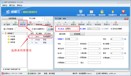 在功能導航窗點擊基礎資料----員工信息,在員工信息界面選中系統管理員信息,點擊修改,在員工姓名項輸入人名點擊保存,如圖所示: