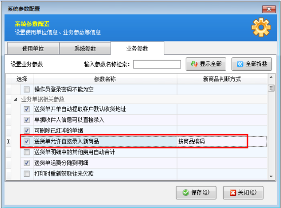 參數設置完成后,在業務參數中找到參數“送貨單允許直接錄入新商品”,新商品判斷方式修改為“按商品編碼”,然后開單新增新商品,會按商品編碼進行區分是否存在,不存在的商品會黑體加粗顯示,如下圖所示: