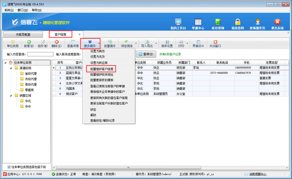 在功能導航窗點擊“基礎資料”—》“客戶信息”,在客戶信息界面工具欄點擊“更多操作”下的“批量維護客戶信息”進入批量維護客戶信息界面,如下圖所示:
