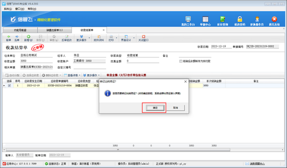 選擇收款結算單,然后點擊“查看結算單”按鈕打開銷售出庫單相關的收款結算單界面,在收款結算單界面工具欄點擊“更多操作”—》“轉記出納憑證”,在彈出的提示信息窗口點擊“確定”即可打開“出納憑證—新增”窗口,核對憑證信息,保存出納憑證即可,如下圖所示。