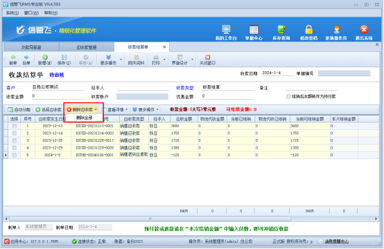系統彈出收款結算單界面,會默認顯示此客戶所有未結銷的應收款記錄,需要批量結銷上月的應收款,先點擊明細工具欄“刪除應收款”下的“刪除全部”按鈕,把顯示的應收款記錄全部刪除,再點擊“選擇應收款”,系統會彈出選擇待核銷的應收款界面,如下圖所示:
